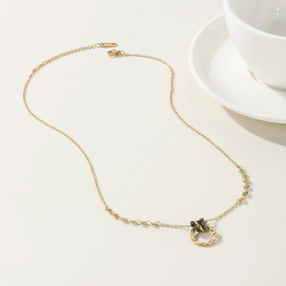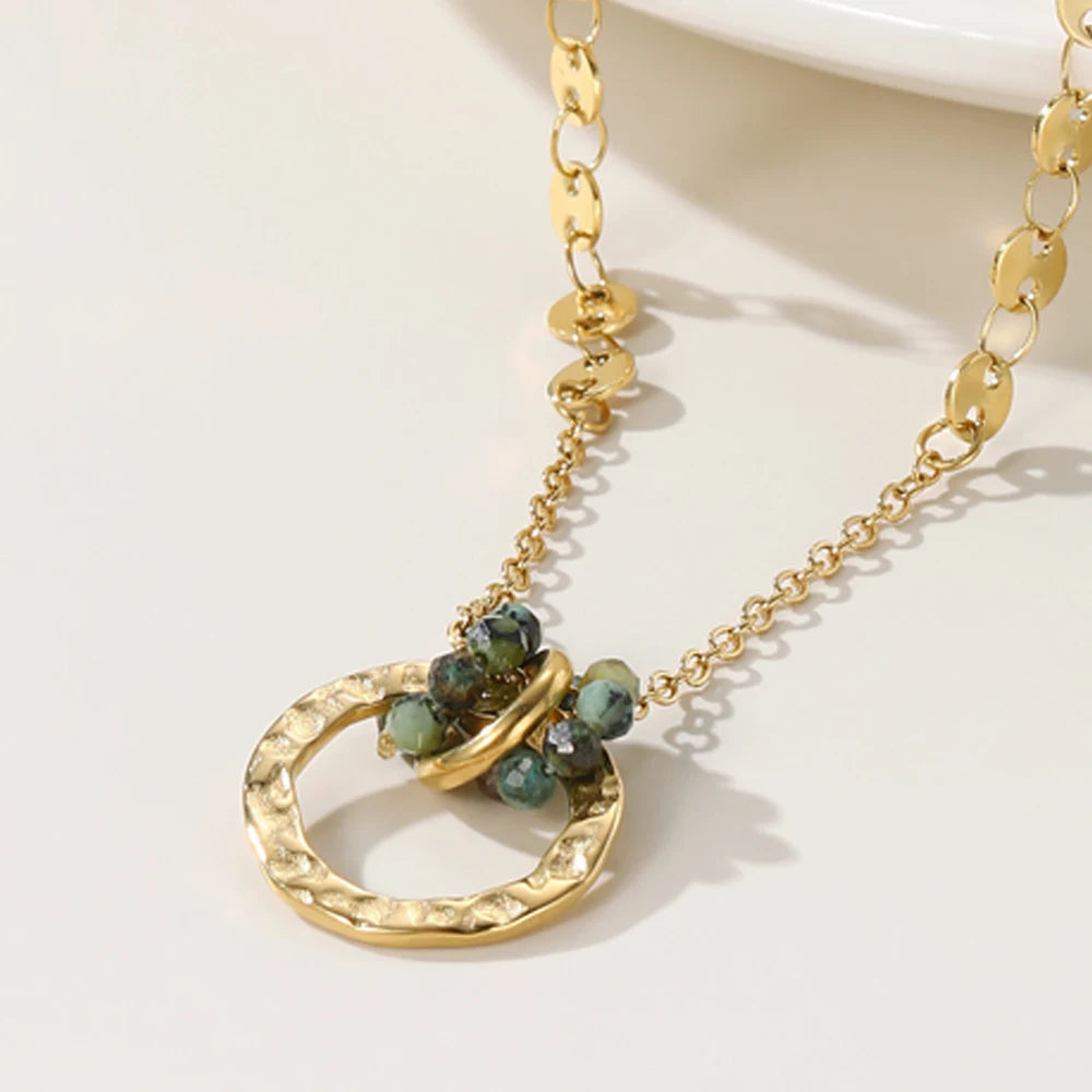 Collier pendentif en acier inoxydable pour femme, orné d'une pierre turquoise naturelle et de zircons. Plaqué or 18k, ce bijou allie élégance intemporelle et matériaux durables.